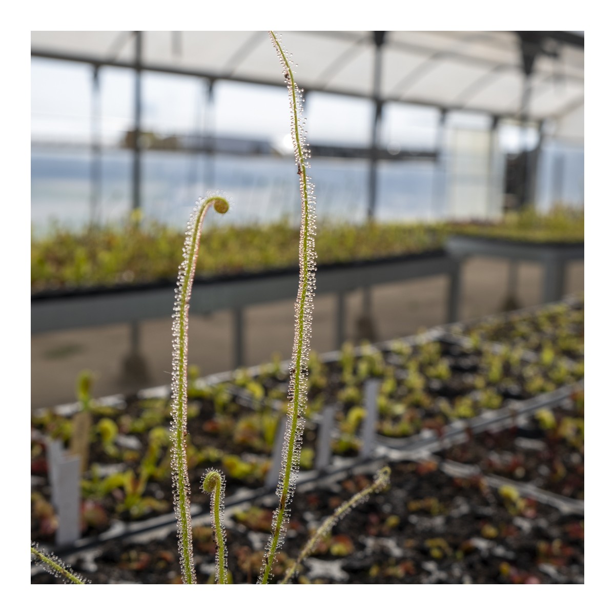 Una de las droseras más espectaculares. Destaca por sus trampas erguidas y bien pegajosas. Es necesario que reciba alguna hora de sol directo durante los meses de verano para así mantenerse erguida.