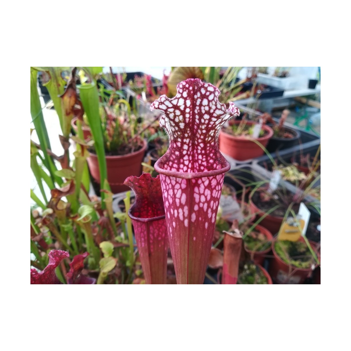 Precioso híbrido de color rojizo. Híbrido resultado del cruce entre Sarracenia leucophylla y Sarracenia rubra.